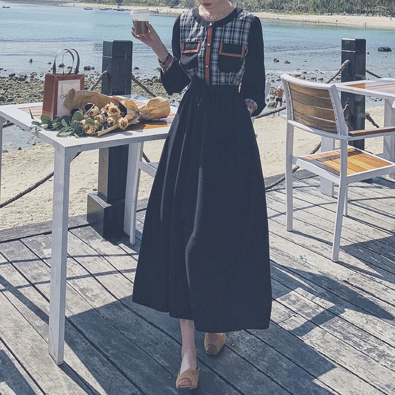 チェック地をアクセントにした配色切り替えシャツワンピース。プレーンなフレアワンピースにトップスのデザインが新鮮味溢れる1枚。ハイウエストで長めのリボンを結ぶとぐっと女性らしさが増していきます