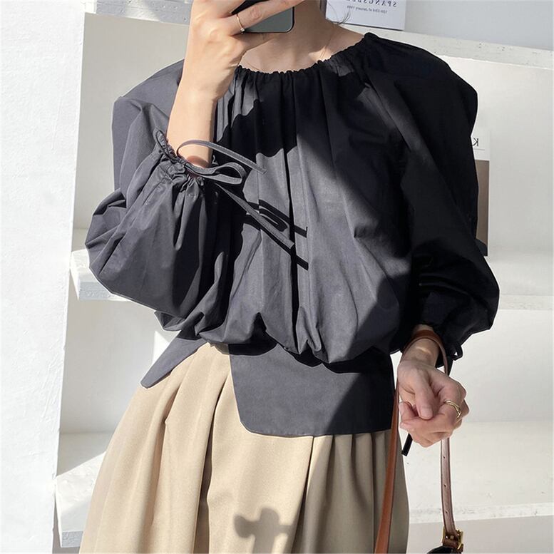 3color レディース ギャザープルオーバーブラウス トップス シャツ バルーンスリーブ袖口リボンギャザーネックペプラムブラウス 白シャツ 白トップス 長袖 ラウンドネック 切り替えデザイン ウエストマーク ハイウエスト 大人可愛い きれいめ 上品 レトロ 大人女子 こなれ感 キュート ガーリー エレガント 白 ホワイト 黒 ブラック グレー 二の腕カバー モテ インスタ映え おしゃれ 春夏 春 夏 秋冬 秋 オフィス 通勤 通学 パーティー 二次会 デート お出かけ
