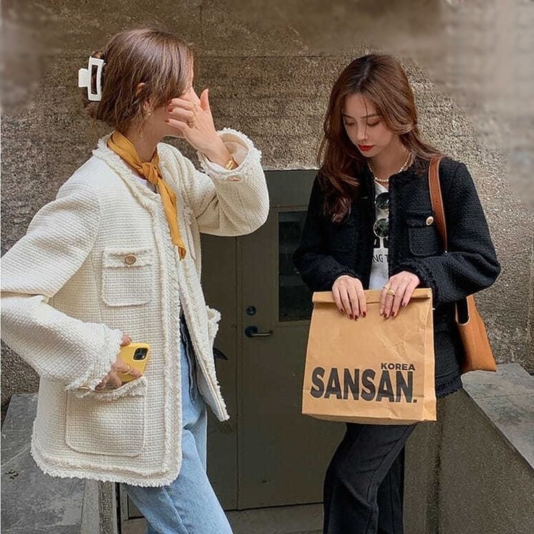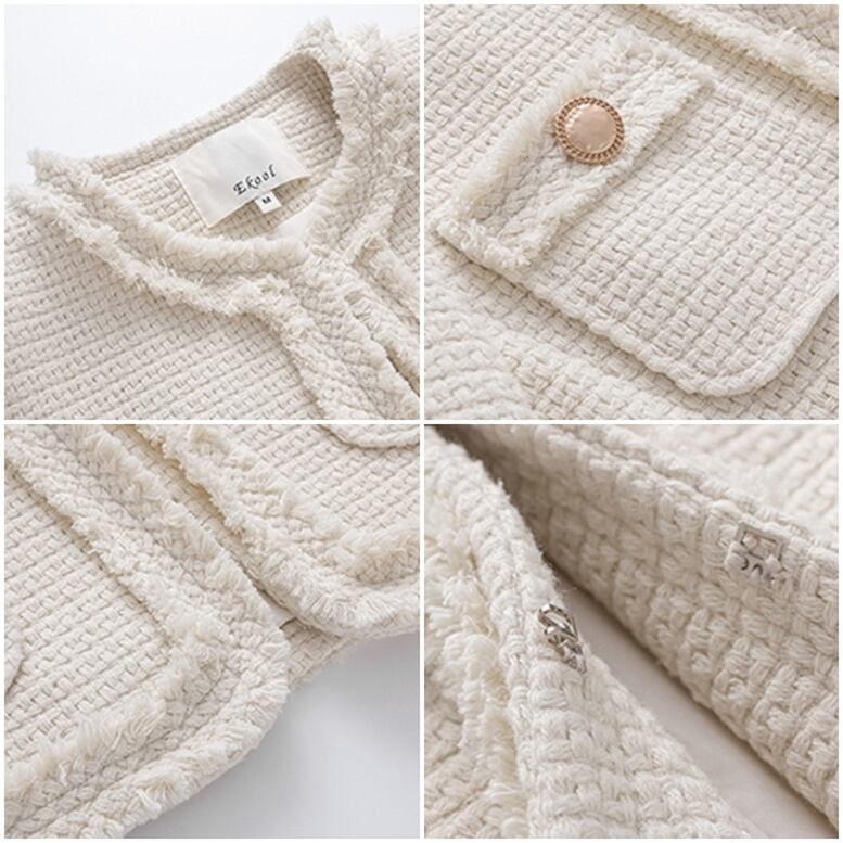 2color レディース ツイードジャケット ノーカラーツイードBIGジャケット アウター ボタンレス ポケット付き クルーネック フリンジ 長め丈 オーバーサイズ ノーボタン 黒 ブラック 白 ホワイト 春夏 春 秋冬 秋 冬 ゆったり 大人可愛い きれいめ エレガント 上品 クラシック レトロ ガーリー おしゃれ かわいい 華やか オフィス 通勤 通学 パーティー 二次会 フォーマル オケージョン デート お出かけ お呼ばれ 女子会 デイリー 休日 重ね着 体型カバー インスタ映え トレンド 定番
