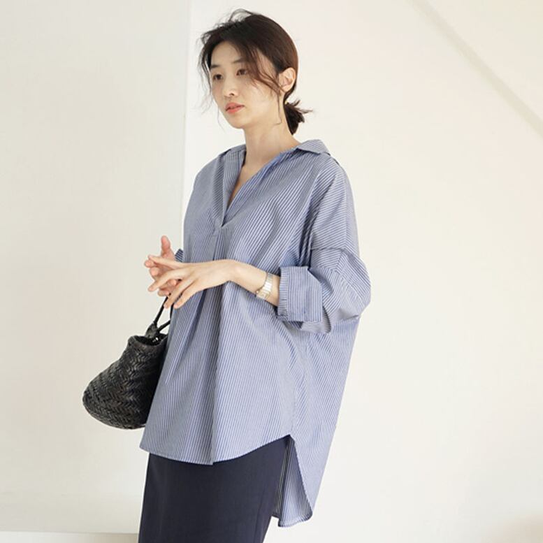2color レディース バックボタンブラウス トップス バックボタン シャツ バックボタンスキッパーシャツ オーバーシャツ 襟付き 7分袖 ドロップショルダー フィッシュテール ビッグシルエット 無地 ストライプ 青 ブルー 白 ホワイト 春夏 春 夏 秋冬 秋 冬 ゆったり 大人可愛い きれいめ ガーリー ナチュラル 大人女子 ラフ マニッシュ ルーズ 大人 モード系 スタイリッシュ おしゃれ かわいい 通勤 通学 お出かけ 女子会 デイリー 休日 重ね着 楽ちん 体型カバー 二の腕カバー 定番