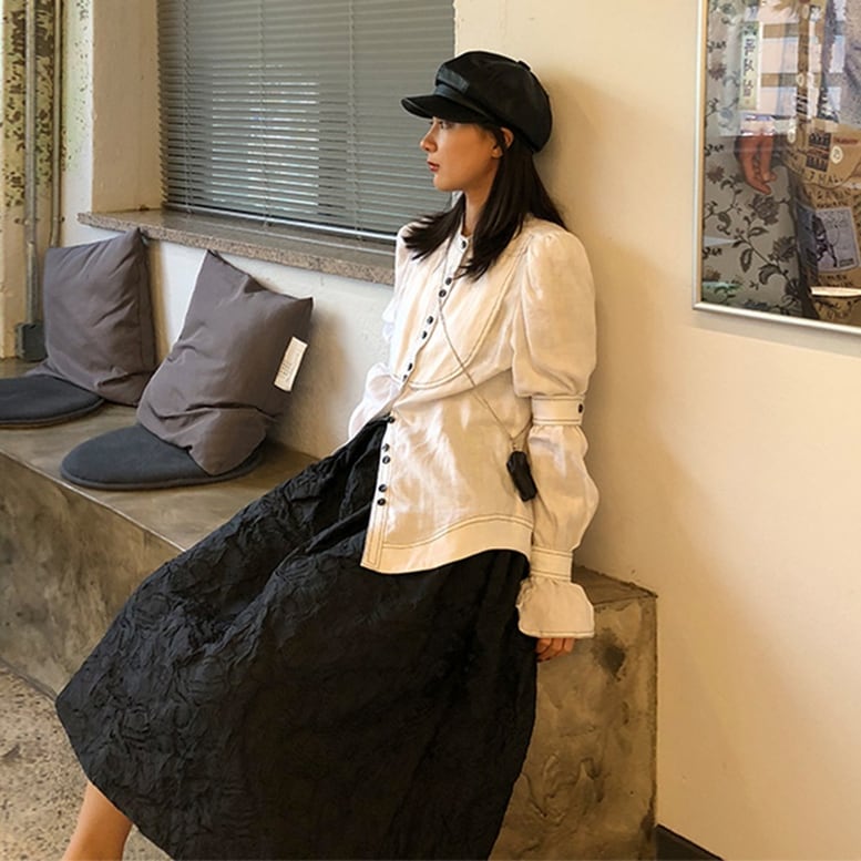 配色にしたステッチやボタンがポイントのシャツトップス。ほどよくハリがあるコットンライクな素材で1枚でも様になるアイテム。ベルトで絞ったキャンディ風スリーブも魅力的なポイントです