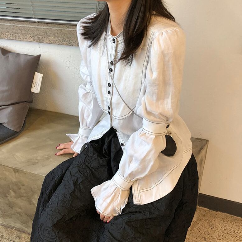 レディース 袖コンシャスシャツトップス ステッチシャツ コットンシャツ ボタンデザインブラウス シャツジャケット ノーカラー パフスリーブ 長袖 フリル 白 ホワイト 春夏 春 夏 秋冬 秋 冬 大人可愛い きれいめ エレガント 上品 クラシック レトロ ガーリー ナチュラル 大人女子 スタイリッシュ おしゃれ かわいい 華やか オフィス 通勤 通学 二次会 デート お出かけ お呼ばれ 演奏会 発表会 女子会 高見え インスタ映え