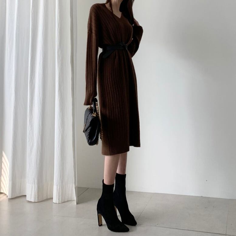 大人っぽく仕上げて女性らしさがぐんと急上昇させたリブ編みのニットワンピース。品の良いVネックの首元にすとんと落ちるフォルムで美シルエットを実現しました。ベルトをプラスしたりスニーカーで外したりなどきれいめなスタイリングを演出します