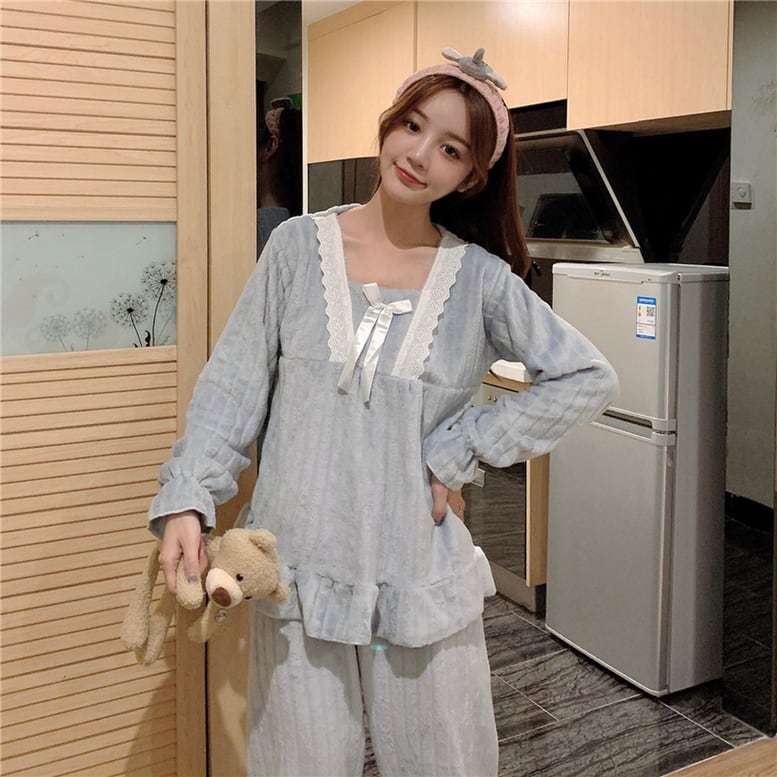 アイスカラーにレースやリボンがロマンティックな愛されパジャマ。ふわふわの素材感に幅広めのリブラインが上品な雰囲気を演出します。お家でゆったり過ごす時間を楽しいものにしてくれる可愛いアイテムです。
