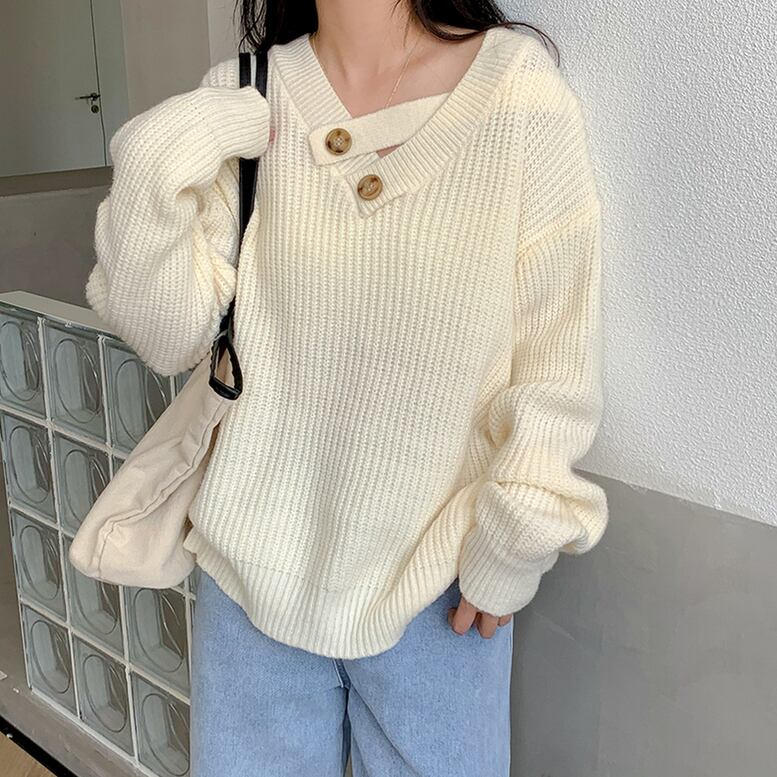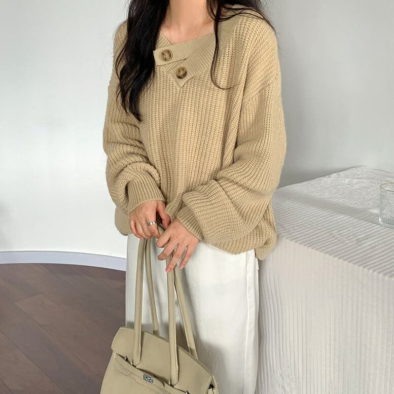 3color レディース ダブルボタンVネックニット アシメントリーVネックルーズシルエットニットセーター リブニットセーター プルオーバー トップス ざっくりセーター ハイゲージニット クロスネック 長袖 ドロップショルダー オーバーサイズ カーキ ベージュ ブラック 春夏 春 夏 秋冬 秋 冬 ニュアンスカラー ゆったり 大人可愛い きれいめ エレガント 上品 レトロ ガーリー 大人女子 ラフ ルーズ 通勤 通学 お出かけ 重ね着 楽ちん 体型カバー 二の腕カバー インスタ映え