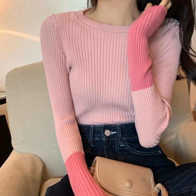4color セーター ニット バイカラー 長袖 ラウンドネック 大人可愛い 上品 お洒落 フリーサイズ ブラック ホワイト ピンク ベージュ 謝恩会 結婚式 二次会 披露宴 20代 30代 40代 デートパーティー イベント 韓国系 インスタ映え