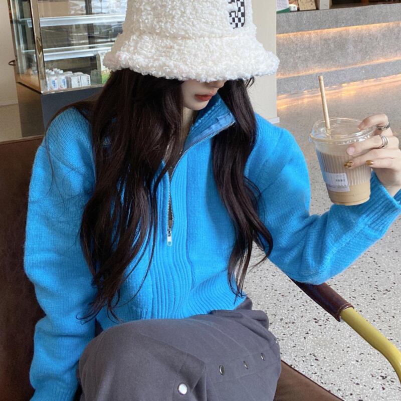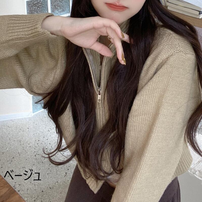 カーディガン ニット ジッパー 長袖 ショート丈 大人可愛い 上品 お洒落 フリーサイズ ブルー ホワイト ベージュ 謝恩会 結婚式 二次会 披露宴 20代 30代 40代 デートパーティー イベント 韓国系 インスタ映え