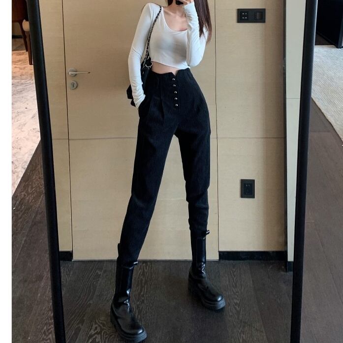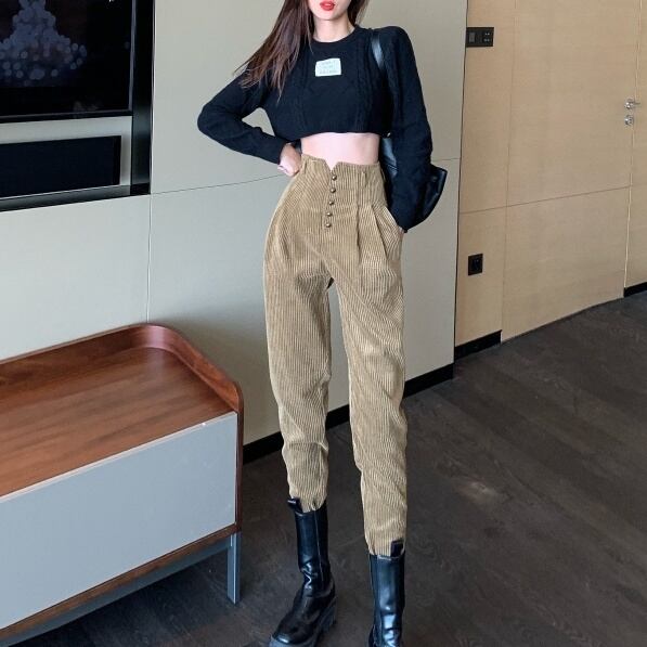 ハイウェスト部分にボタンが沢山付いたシンプルなコーデュロイパンツ。