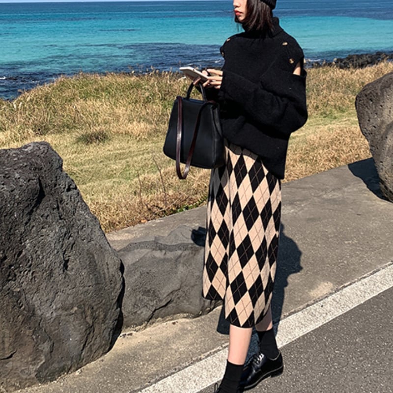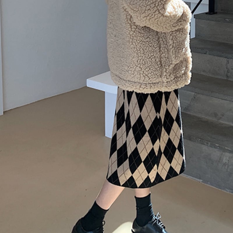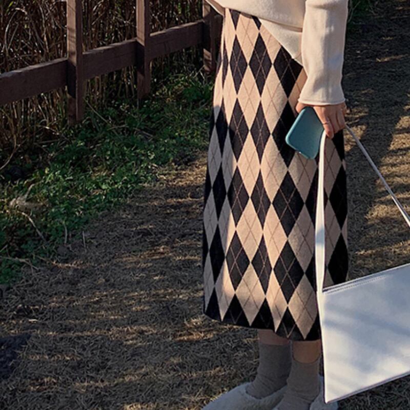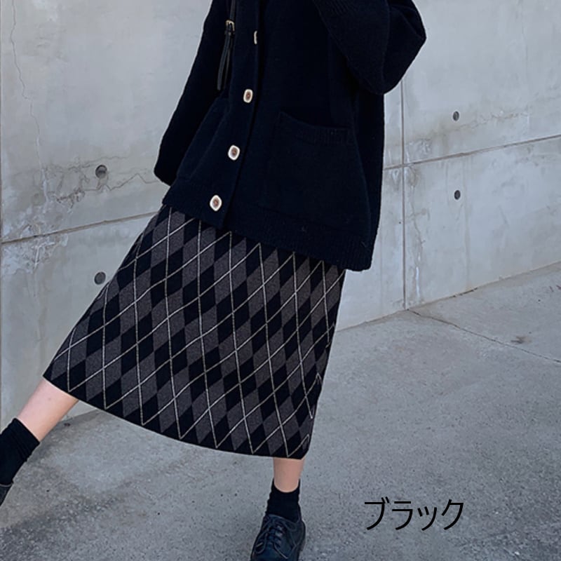 足をスラリと長く見せてくれるダイヤ柄スカート。カジュアルスタイルやきれいめスタイルにぴったり。