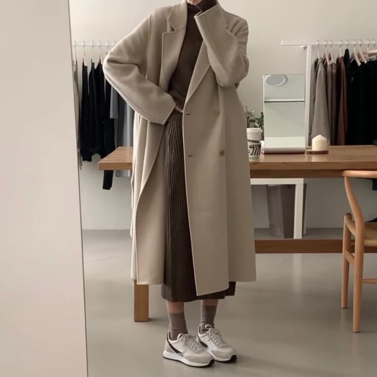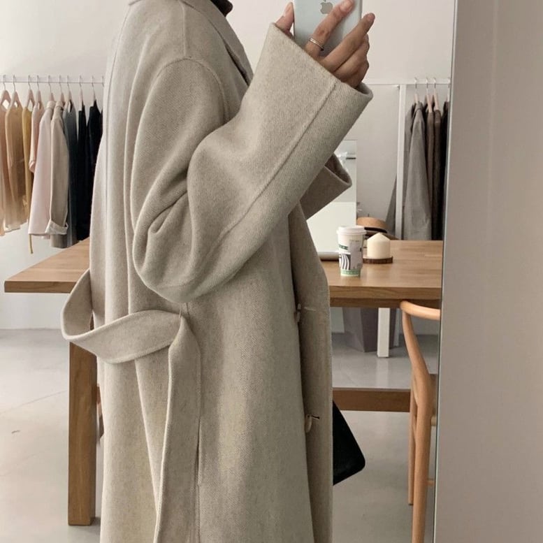 ダブルチェスターでマニッシュなスタイリングへ導くコート。滑らか&柔らかなタッチが上品見えするアイテム。オーバーシルエットで大人の余裕を魅せています