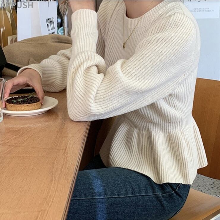 2color レディース トップス ニット セーター ペプラムリブニット ペプラムヘム リブ 袖あり ボリューム袖 ランタンスリーブ プルオーバー ラウンドネック ホワイト ブラック お洒落 おしゃれ 春夏 春 秋冬 秋 冬 ママ ママコーデ 20代 30代 40代 デート お出かけ 普段使い 韓国 トレンド 可愛い 大人 大人女子 大人可愛い 大人カジュアル カジュアル 旅行 海外旅行 仕事 通勤 通学 オフィス 女子会 オフ デイリー 二の腕カバー 体系カバー ギャザー 上品 きれいめ レトロ