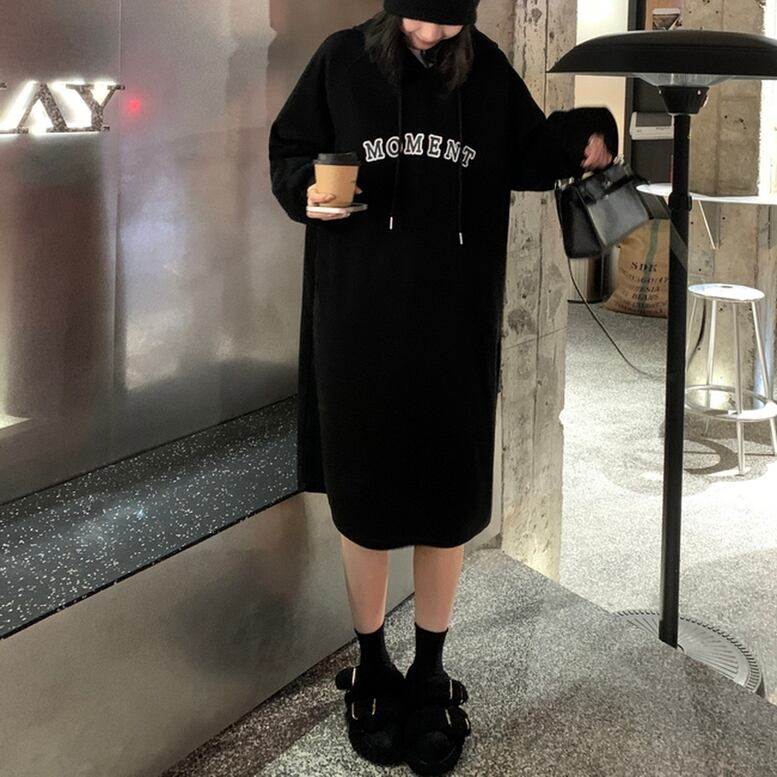 2color レディース パーカースウェットワンピース ロングワンピース ロゴ入りトレーナーワンピ スウェットドレス フーディ ひざ下丈 ロング丈 長袖 ドロップショルダー ボリュームスリーブ フード付き 英字ロゴ オーバーサイズ ビッグシルエット 暖か 黒 ブラック 灰色 グレー モノトーン 春夏 春 夏 秋冬 秋 冬 ニュアンスカラー ゆったり 大人可愛い きれいめ ガーリー 大人女子 マニッシュ ルーズ 通勤 通学 デイリー 休日 重ね着 体型カバー 二の腕カバー インスタ映え 定番