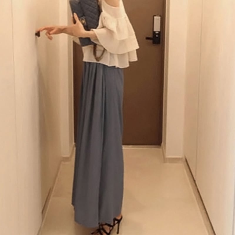 フレア感が優しい印象を与え、ボディラインを拾わないトップスとボトムス。肌見せ感がトレンド押さえたコーデが出来、カジュアルスタイルにもきれいめスタイルにもピッタリ。