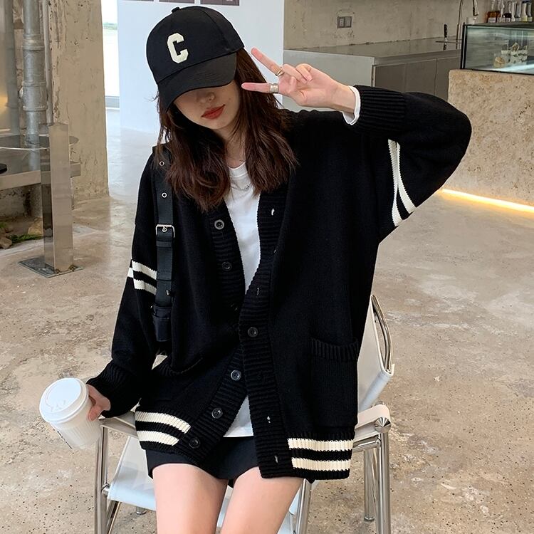 シックで大人可愛い雰囲気を演出するゆったりニットカーディガン。腕と袖の部分に白のラインが入っておりポケットも2つ付いているため機能性も抜群。普段使いはもちろんオフィスシーンやお出かけにも活躍するシーンレスな1枚です