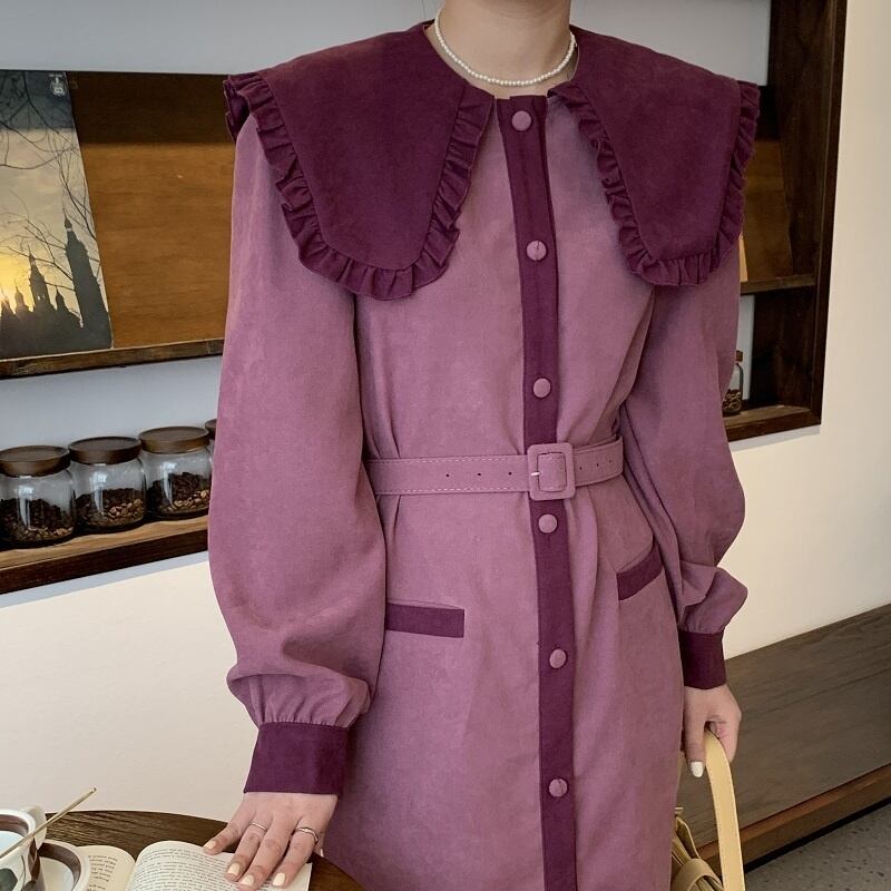 2color レディース アウター コート シャツワンピース ビッグカラー フリルカラー セーラーカラー バイカラー パフスリーブ コーデュロイ 長袖 袖あり ブラック パープル ウエストマーク Aライン 羽織り 前ボタン 2way ロング丈 ロング 大人女子 大人フェミニン お洒落 春夏 春 秋冬 秋 冬 ママコーデ 20代 30代 40代 デート お出かけ 普段使い 韓国 トレンド 大人可愛い 通勤 通学 女子会 旅行 海外旅行 デイリー お呼ばれ パーティー 二次会 二の腕カバー 上品 エレガント
