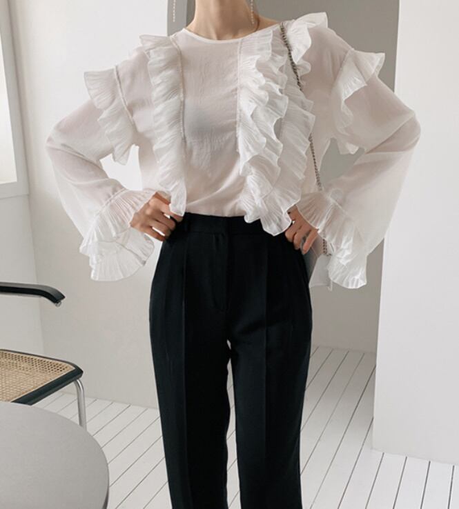 2color レディース トップス フリル 長袖 シフォン ホワイト ブルー エレガント 春 秋 ニュアンスカラー 大人可愛い きれいめ エレガント 上品 クラシック レトロ ガーリー カジュアル 大人可愛い 大人女子 モード系 カジュアル スタイリッシュ おしゃれ 華やか 通勤 通学 デート お出かけ お呼ばれ 女子会 デイリー 休日 イベント 旅行 楽ちん モテ インスタ映え トレンド 定番