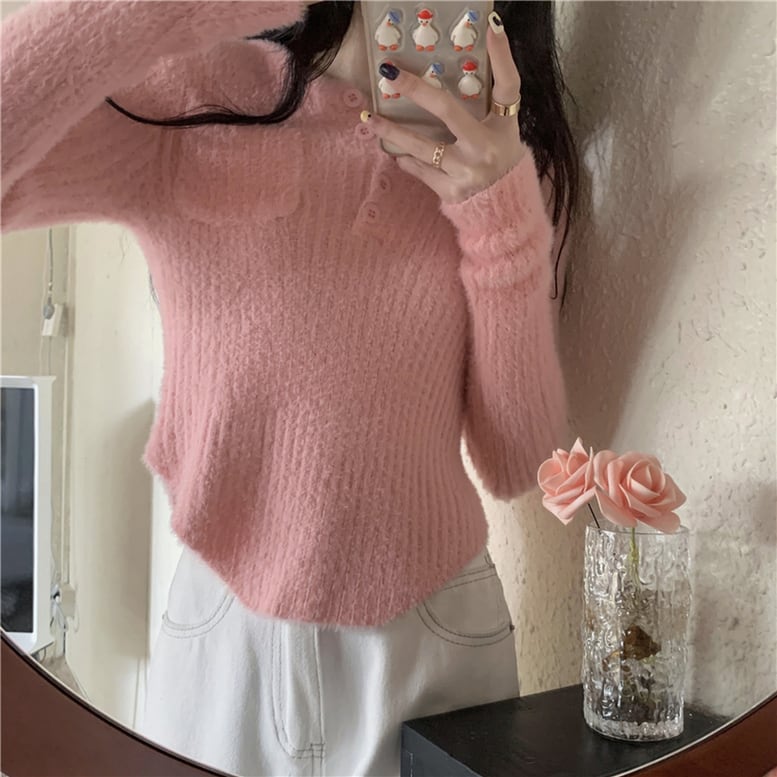 ふわふわのモヘアタッチニットがキュートなゆるニットプルオーバー。裾はサイドをラウンドカットしたデザインでこなれ感を発揮。ラウンドVネックでワンカラーのボタンがアクセントになっています