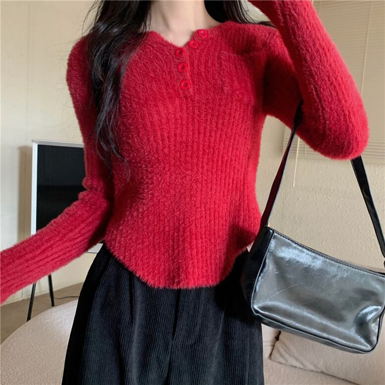 5color レディース モヘアリブニット ロングスリーブニット モヘアタッチキーネックリブニット トップス プルオーバー セーター Vネック 長袖 ドロップショルダー スリム リブ ボタン ブルー ホワイト ピンク レッド ブラック 春夏 春 夏 秋冬 秋 冬 ニュアンスカラー ゆったり 大人可愛い きれいめ エレガント 上品 クラシック レトロ ガーリー 大人女子 通勤 通学 パーティー 二次会 お出かけ 女子会 デイリー 体型カバー 二の腕カバー インスタ映え トレンド