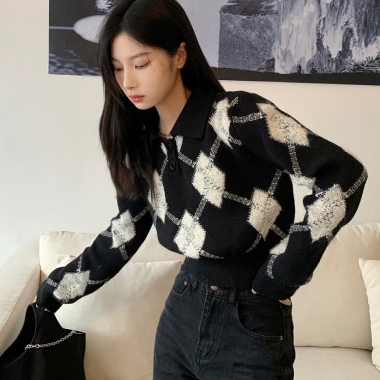 レディース ニット アーガイルポロ ダイヤ柄 アーガイルニット セーター プルオーバー ロングスリーブニット ショート丈 長袖 襟付き スリム バイカラー 黒 ブラック モノトーン 春夏 春 夏 秋冬 秋 冬 ゆったり 大人可愛い きれいめ エレガント 上品 クラシック レトロ ガーリー 大人女子 モード系 おしゃれ 華やか 通勤 通学 パーティー 二次会 デート お出かけ お呼ばれ 女子会 デイリー 休日 イベント 体型カバー 二の腕カバー モテ インスタ映え トレンド
