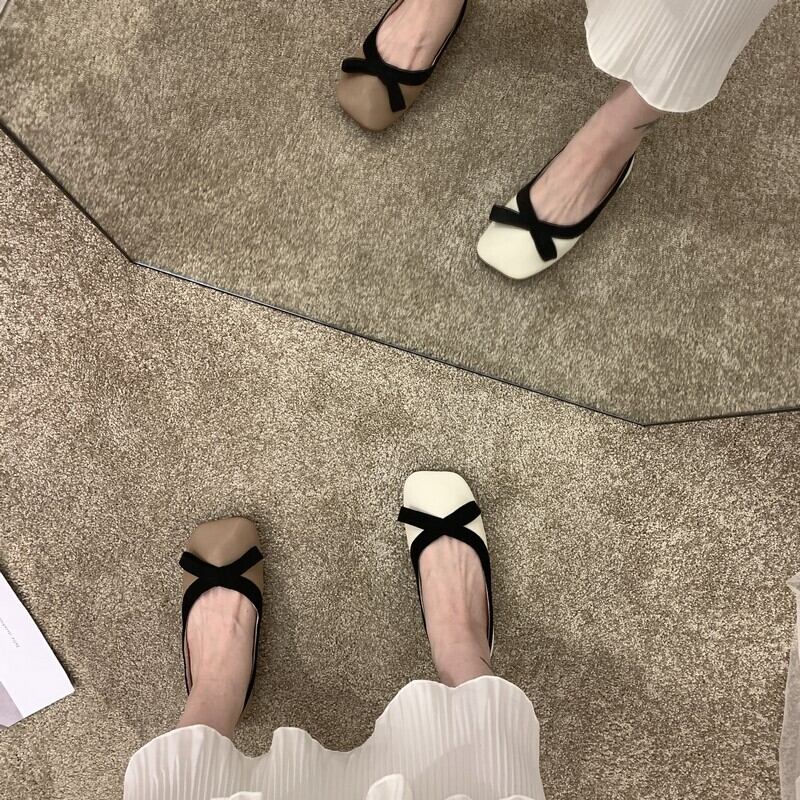バイカラー配色とリボンが大人可愛いスクエアトゥフラットシューズ。