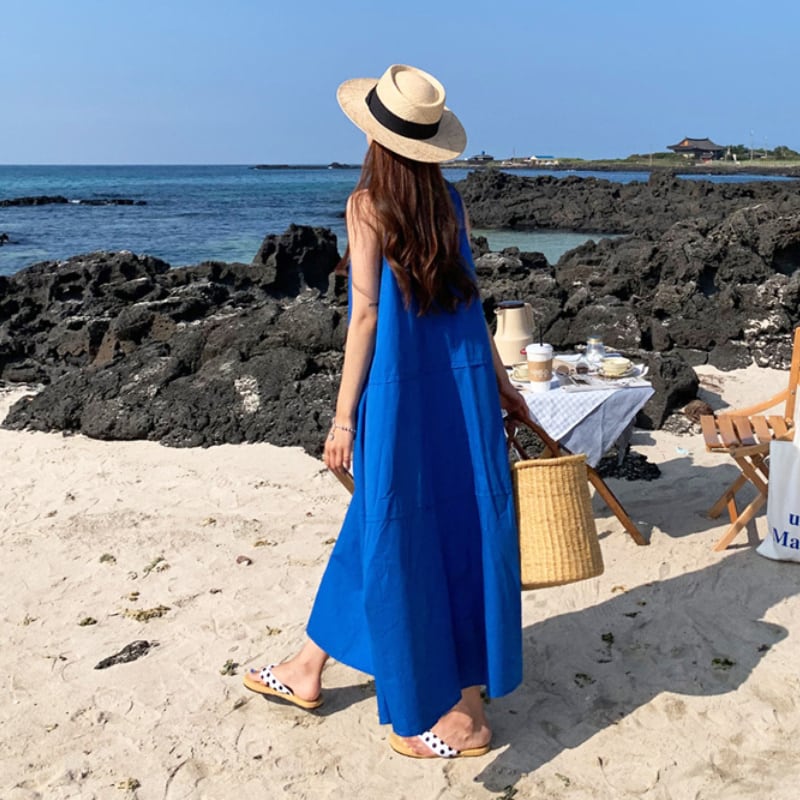 色鮮やかなロング丈ワンピースはボディラインを拾わず体系カバーしてくれます。
