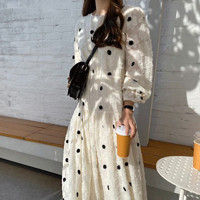 レディース ワンピース ロング丈ワンピース 水玉 ドット ラウンドネック 袖あり 長袖 パフスリーブ フレア ボリューム袖 二の腕カバー フリンジ 花柄 シフォン キュート プルオーバー 大人ガーリー 大人カジュアル カジュアル ホワイト おしゃれ お洒落 春夏 春 夏 20代 30代 40代 デート お出かけ 普段使い 韓国 トレンド かわいい 可愛い 大人 大人女子 大人可愛い 普段使い デイリー 旅行 海外旅行 女子会 レイヤード