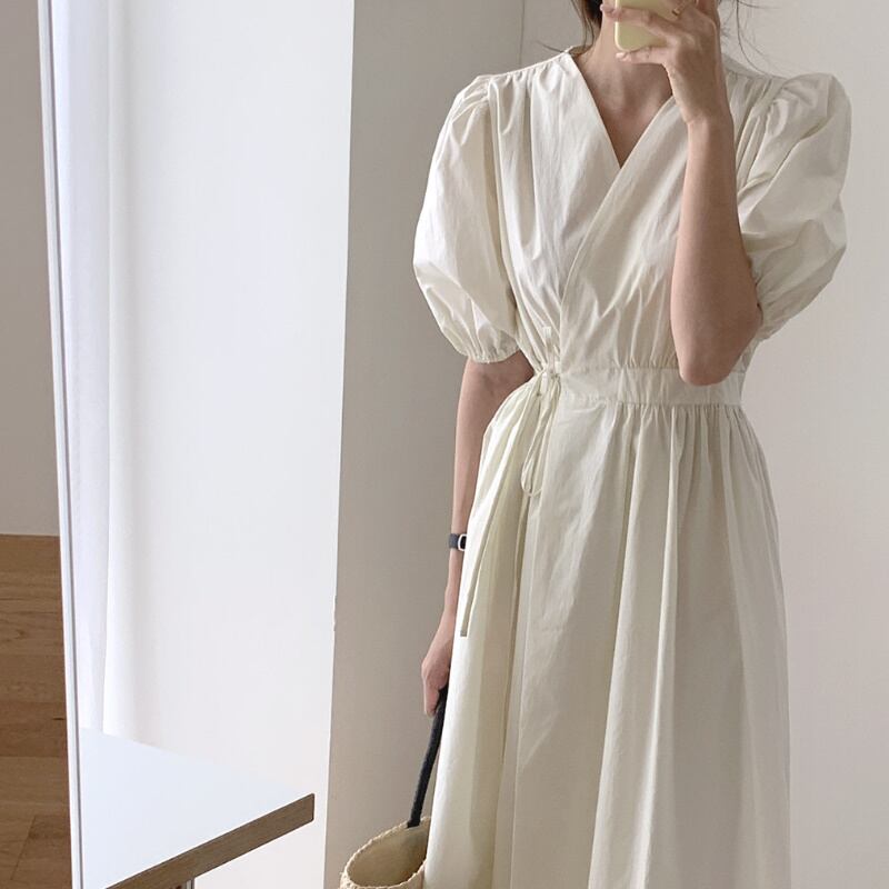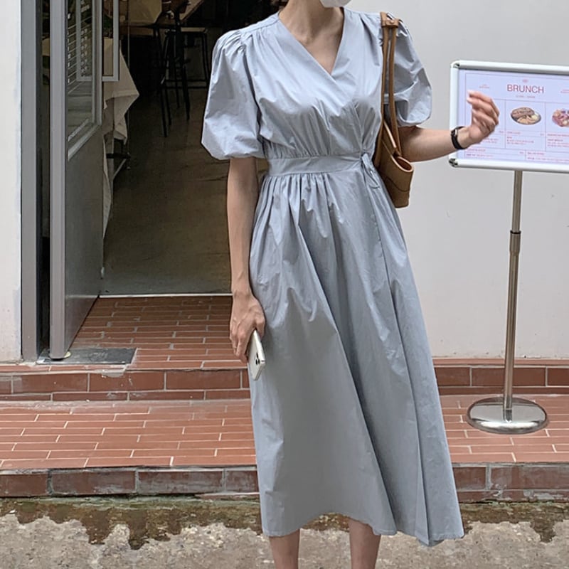 2color レディース ワンピース ロング丈 パフスリーブ 半袖 プルオーバー ガーリー フェミニン 大人カジュアル 小花柄 ブルー お洒落 春夏 春 夏 秋冬 秋 冬 ママ ママコーデ 20代 30代 40代 デート お出かけ 普段使い 韓国 トレンド 可愛い 大人 大人女子 大人可愛い 旅行 海外旅行 休日 デイリー 女子会 定番