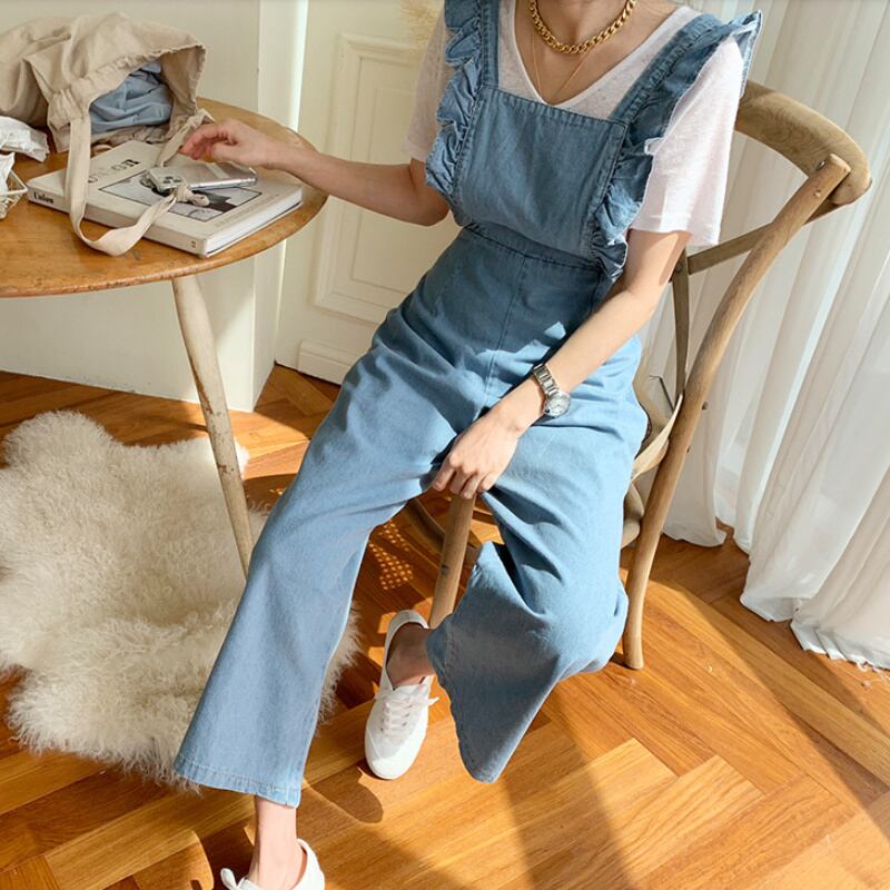 2color レディース オールインワン デニム フリル ガーリー フェミニン 大人カジュアル 小花柄 ブルー お洒落 春夏 春 夏 秋冬 秋 冬 ママ ママコーデ 20代 30代 40代 デート お出かけ 普段使い 韓国 トレンド 可愛い 大人 大人女子 大人可愛い 旅行 海外旅行 休日 デイリー 女子会 定番