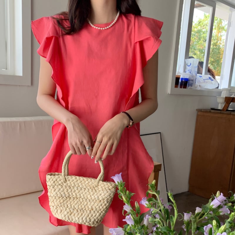 フリルデザインが大人可愛い半袖ワンピース。