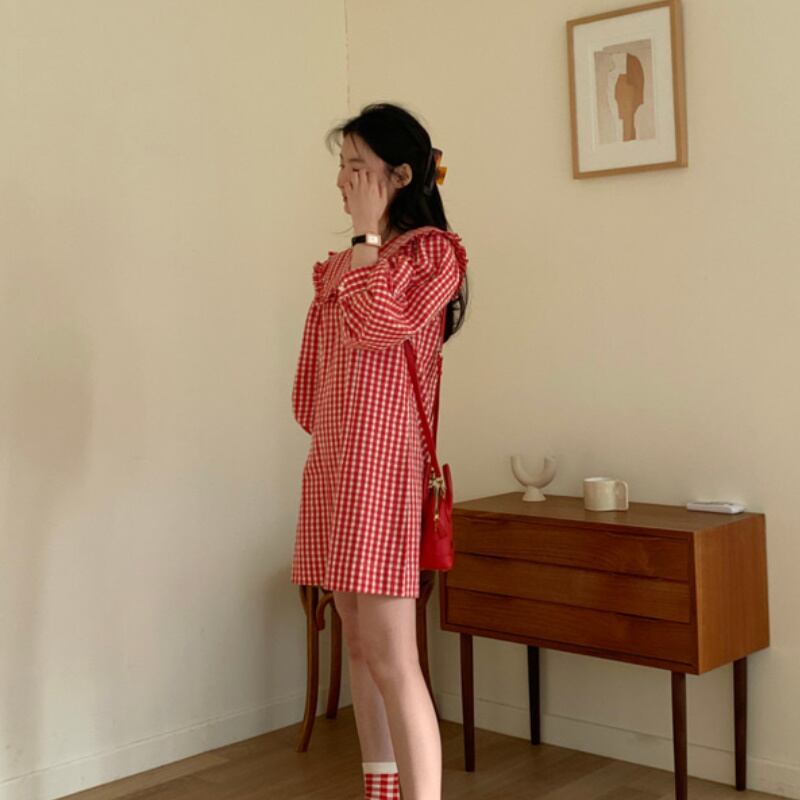 2color レディース ワンピース ギンガムチェック 袖あり 赤 レッド 黒 ブラック 大人可愛い きれいめ 大人 上品 おしゃれ レトロ マニッシュ キュート ガーリー ルーズ エレガント フォーマル 春 夏 秋 冬 二次会 オフィス 通勤 通学 デート お出かけ パーティー イベント 女子会 休日 リゾート 旅行 海 体型カバー ニュアンスカラー
