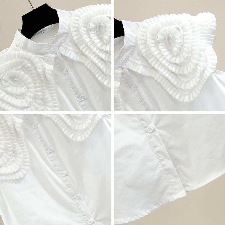 ビックカラーにフリルであしらったデザインが個性的なシャツブラウス。