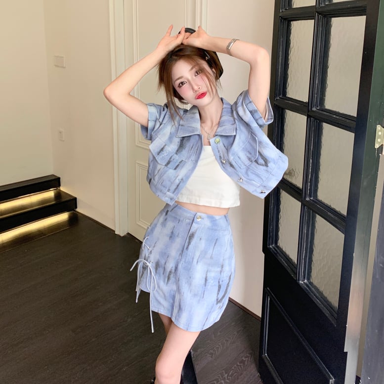 淡いトーンにペイント風のラインが際立つウォッシャブルなデニムセットアップ。ショート丈のジャケットは小ぶりのパフ袖が可愛らしいデザイン。スカートはレースアップのスリットが施され色っぽさをプラスします