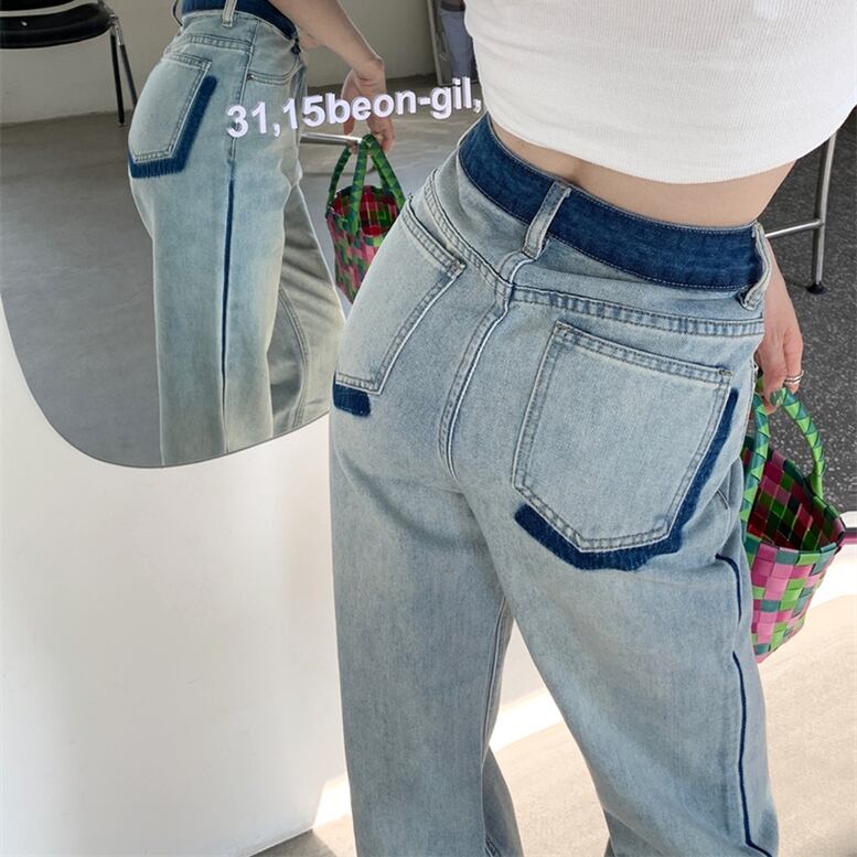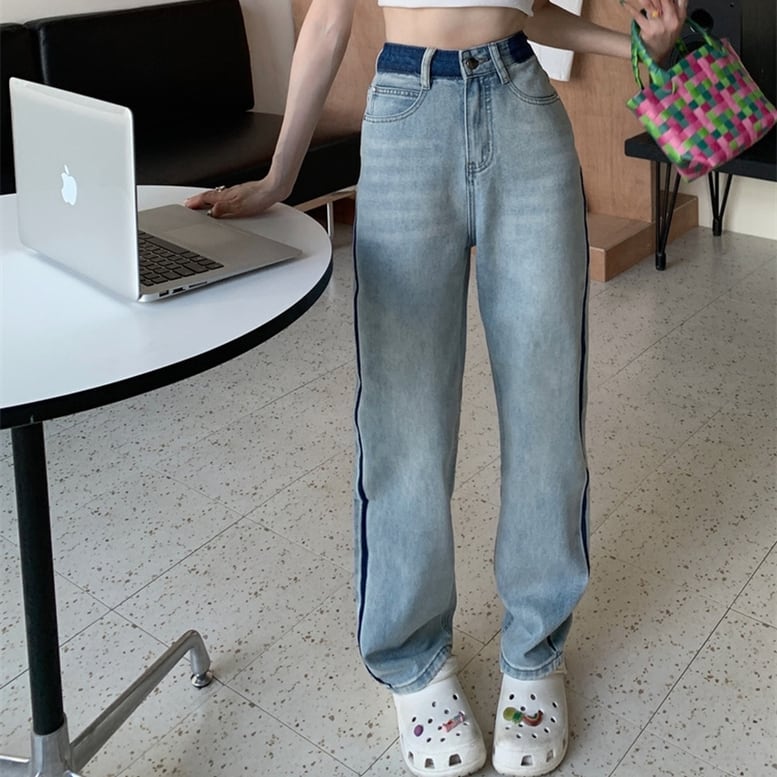 レディース 配色デニムパンツ ストレート パンツ ワイドパンツ デニム ボトムス ウエストマーク サイドライン 長さ 選べる ハイウエスト フルレングス ブルー 大人可愛い きれいめ 上品 マニッシュ キュート ガーリー ルーズ エレガント フォーマル 春 夏 秋 冬 二次会 オフィス ビジネス OL 通勤 学生 通学 デート お出かけ パーティー イベント 女子会 休日 アウトドア 体型カバー 普段使い トレンド ゆったり インスタ映え バイカラー