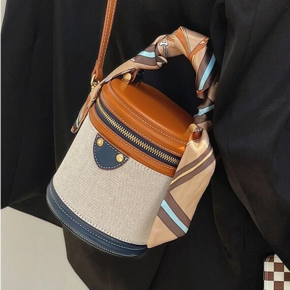持ち手部分にスカーフをあしらったエレガントなバケットバッグ。