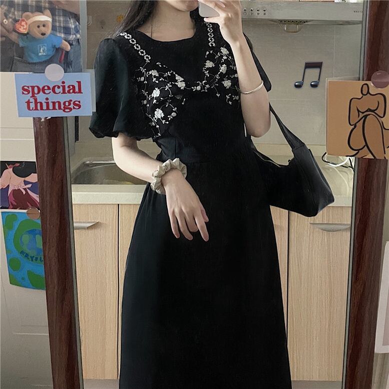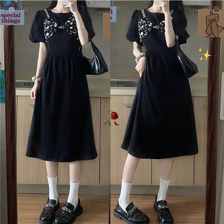 レディース ワンピース 重ね着風 ロング丈 パフスリーブ ビスチェ フェイクレイヤード キャミソール ドッキング ドレス ラウンドネック 半袖 フレア ひざ下丈 黒 ブラック ワンピドレス 大人可愛い きれいめ 上品 レトロ ガーリー エレガント フォーマル 春 夏 秋 冬 二次会 オフィス ビジネス OL 通勤 学生 通学 デート お出かけ パーティー イベント 女子会 体型カバー 普段使い トレンド ゆったり インスタ映え バイカラー モノトーン