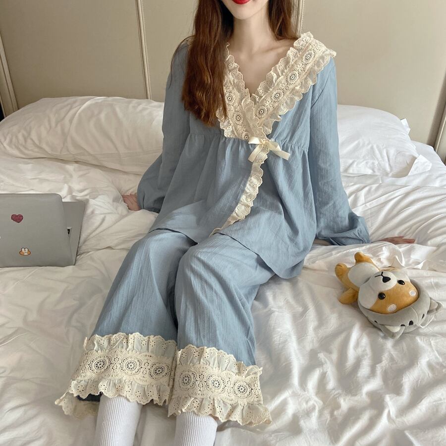 2color レディース ルームウェア 部屋着 寝巻 ナイトウェア リラックスウェア トップス パンツ セットアップ ツーピース 袖あり 長袖 レース おうち時間 Vネック リボン シンプル レトロ セクシー フェミニン ガーリー 甘め 無地 ピンク ブルー お洒落 春夏 春 夏 秋 ママ ママコーデ 20代 30代 40代 普段使い 韓国 トレンド 可愛い 大人 大人女子 大人可愛い お泊まり 女子会 旅行 海外旅行 インスタ映え バイカラー パステルカラー