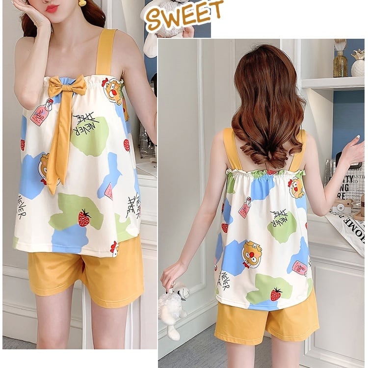 フルーツ柄やアニマル柄がキュートなノースリーブトップス&ショートパンツのルームウェアセットアップ。M~5XLとサイズ展開豊富なのが嬉しいポイント◎胸元のリボンが女の子らしい印象に。