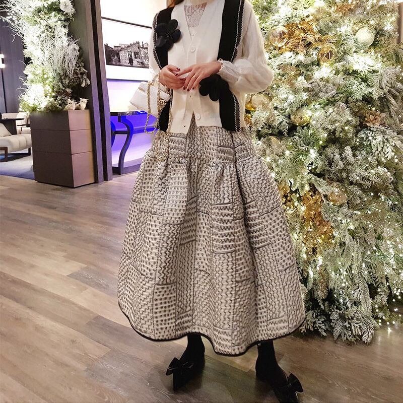 2color レディース スカート ミモレ丈スカート ボリュームスカート フレアスカート ハイウエスト ジャカード 立体感 個性的 楽ちん ウエストゴム カジュアル 大人カジュアル きれいめ 上品 裏地付き パイピング クール モード モノクロ ホワイト ブラック お洒落 春 秋冬 秋 冬 ママ ママコーデ 20代 30代 40代 デート お出かけ 普段使い 韓国 トレンド 可愛い 大人 大人女子 大人可愛い 通学 女子会 着回し デイリー こなれ感 暖かい 華奢見え