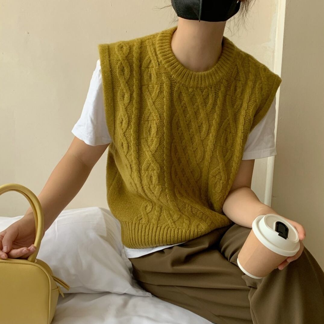 秋冬の定番!立体感が可愛いケーブル編みニットベスト。