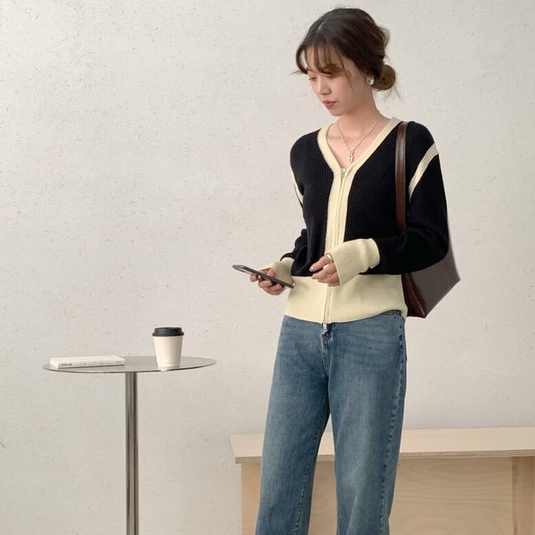 上下ジッパーのディテールにバイカラーが引き立つニットカーディガン