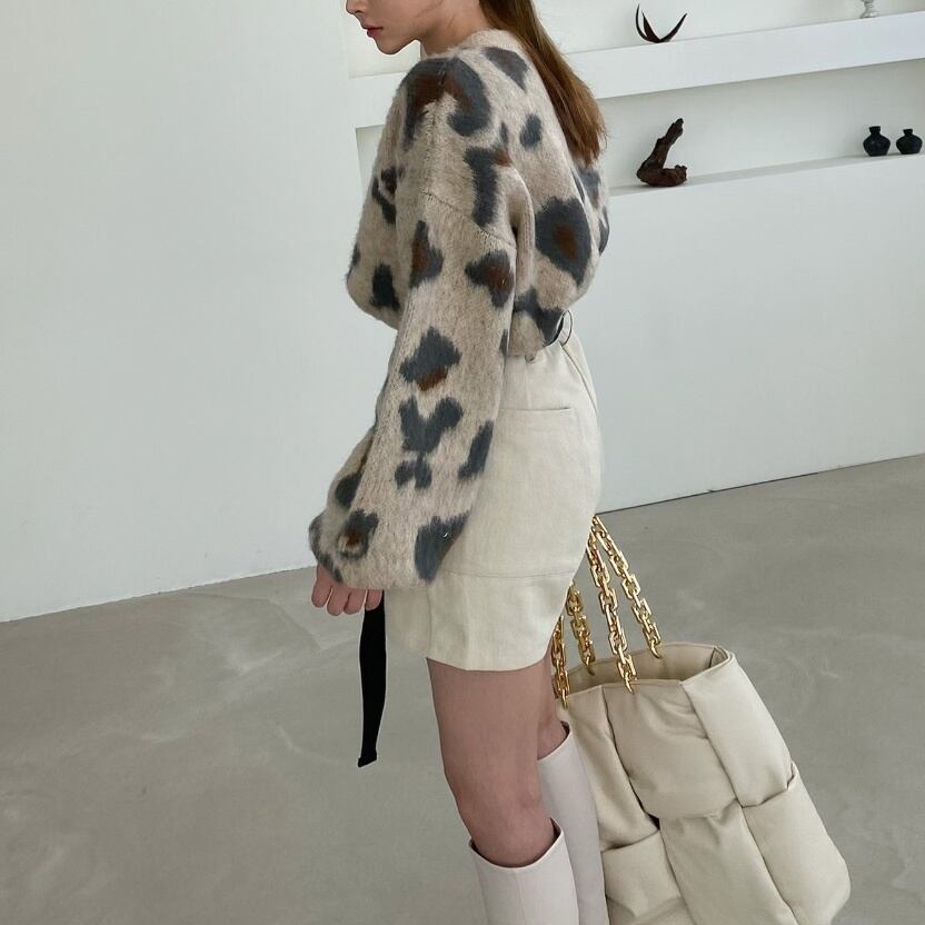 大柄のレオパード柄が目をひくニットとショールのセットアップ。