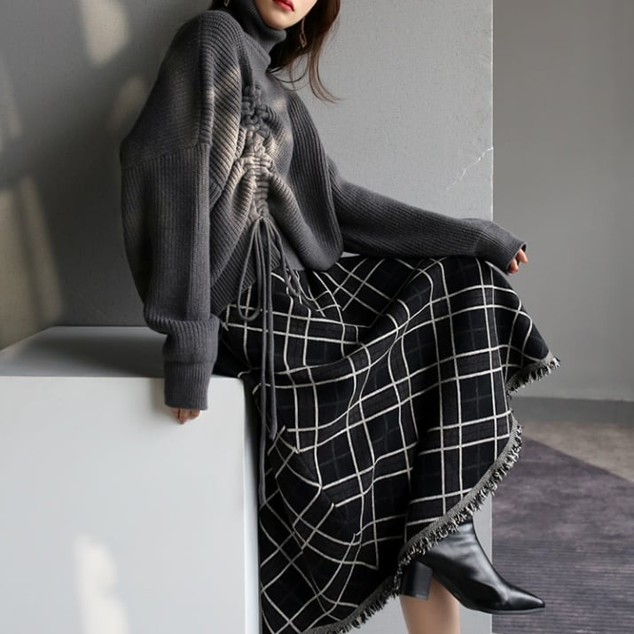 2color レディース スカート ロングスカート ニットスカート フリンジ Aライン チェック柄 ハイウエスト レトロ クラシック カジュアル 大人カジュアル きれいめ 上品 カーキ ブラック お洒落 春 秋冬 秋 冬 ママ ママコーデ 20代 30代 40代 デート お出かけ 普段使い 韓国 トレンド 可愛い 大人 大人女子 大人可愛い オフィス 通勤 通学 学生 女子会 着回し デイリー こなれ感 暖かい あったか 体系カバー インスタ映え
