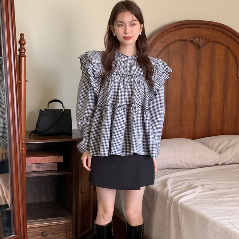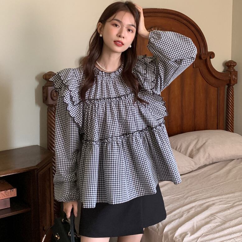 2color レディース フリルブラウス フレアブラウス トップス ブラウス フリル フレア 長袖 ハイネック 無地 チェック柄 フリルシャツ フレアシャツ ギンガムチェック 黒 白 ホワイト 大人可愛い きれいめ 上品 エレガント ガーリー マニッシュ ルーズ キュート レトロ 大人女子 おしゃれ シンプル カジュアル 春 夏 秋 冬 二次会 オフィス OL 通勤 学生 通学 デート お出かけ パーティー イベント 女子会 休日 旅行 体型カバー モテ 普段使い 定番 トレンド ゆったり インスタ映え