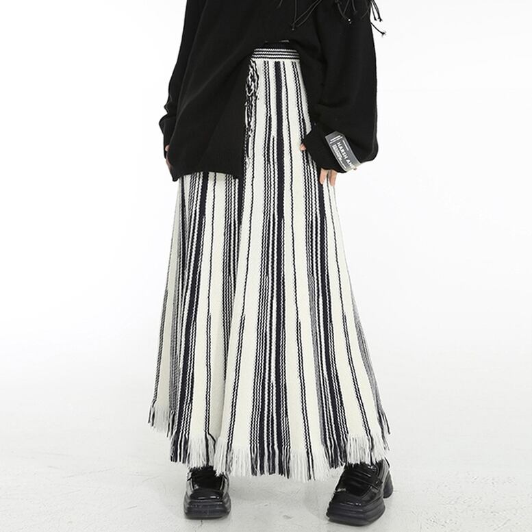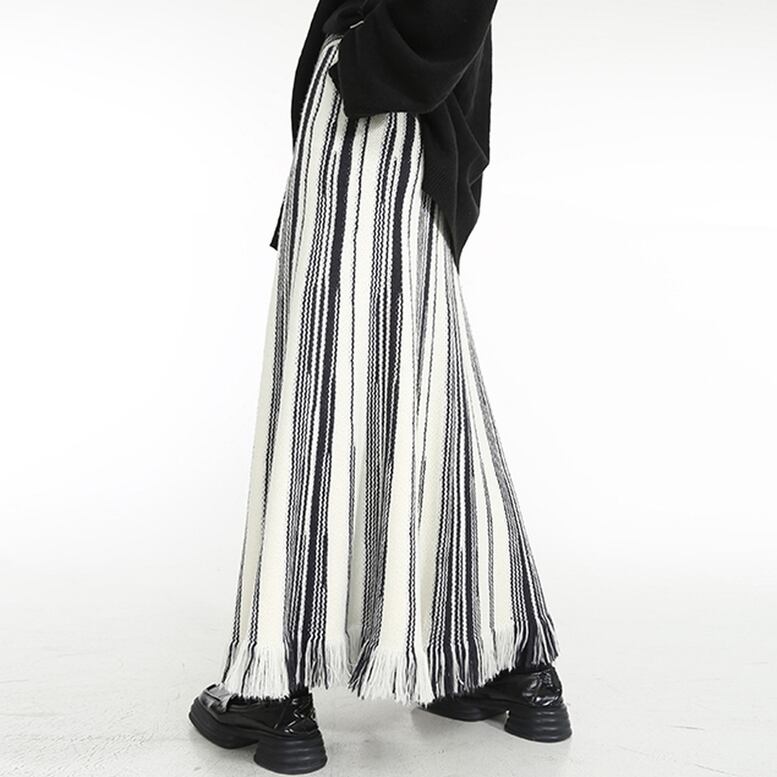 レディース スカート ニットプリーツロングスカート ニットスカート ロングスカート マキシスカート ストライプ柄 ウエストゴム ロング丈 マキシ丈 裾フリンジ ニット クラシカル 白 黒 ホワイト ブラック 大人可愛い きれいめ 上品 エレガント ガーリー クール モード系 大人女子 おしゃれ シンプル カジュアル 春 夏 秋 冬 二次会 オフィス OL 通勤 学生 通学 デート お出かけ パーティー イベント 女子会 休日 体型カバー モテ 普段使い 定番 トレンド ゆったり インスタ映え モノトーン