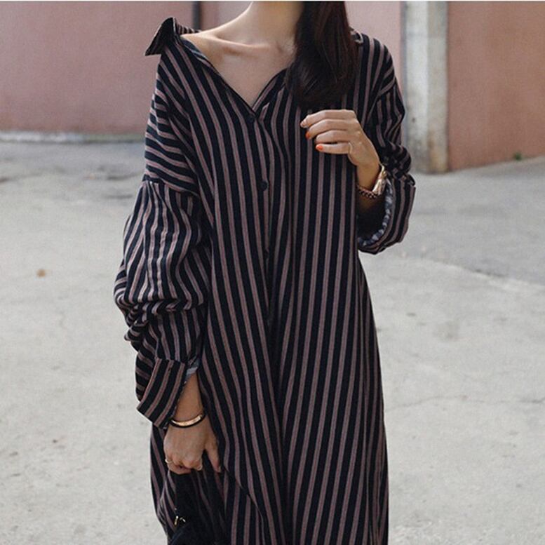 ルーズな着こなしでこなれ感を発揮するストライプシャツワンピ