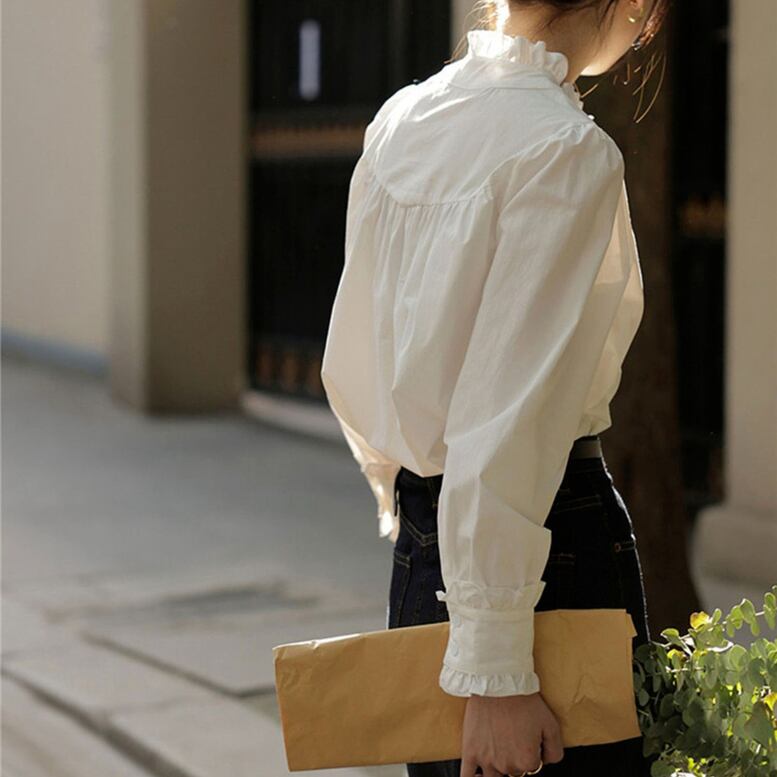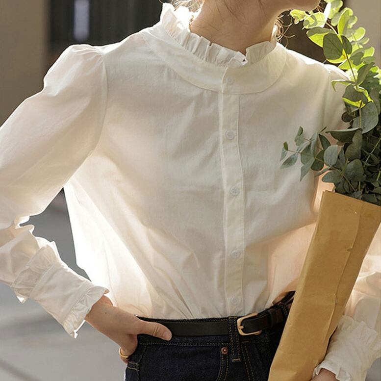 レディース シャツ トップス ブラウス フリルシャツ ハイネック フリルブラウス ノーカラーシャツ 長袖 無地 コットンシャツ 白 ホワイト オシャレ シンプル きちんと感 可愛い キレイめ 上品 フェミニン ちょい甘 知的 ハンサム マニッシュ カジュアル 春 夏 秋 冬 おでかけ シーズンレス デイリー 仕事 オンオフ兼用 オケージョン 普段着 定番 ベーシック 王道 万能 機能性 ミニマム スマート コンパクト 細見え スタイルアップ 高見え 新鮮 上級者 主役級 鮮度アップ トレンド エレガント
