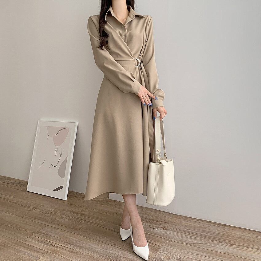 3color レディース ワンピース ミドル丈ワンピース ミドル丈 ラップワンピース シャツワンピース 膝下 袖あり 長袖 ポロ襟 きちんと感 Aライン フレア ハイウエスト ウエストマーク イレギュラーヘム エレガント ガーリー 上品 きれいめ カーキ ベージュ ブラック お洒落 春夏 春 夏 秋 ママ 20代 30代 40代 デート お出かけ 普段使い 韓国 トレンド 可愛い 大人 大人女子 大人可愛い 旅行 海外旅行 通勤 通学 休日 女子会 こなれ感 体系カバー ゆったり 定番 インスタ映え