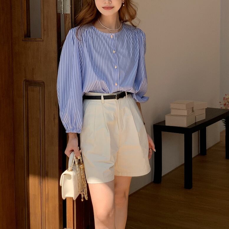 レディース ストライプノーカラーシャツ トップス シャツ ストライプ柄 ラウンドネック パールボタン 長袖 ボリュームスリーブ ストライプ柄ブラウス ノーカラーシャツ ブラウス ブルー オシャレ きちんと感 可愛い キレイめ 上品 フェミニン シック 知的 ハンサム マニッシュ カジュアル 春 夏 秋 冬 デイリー おでかけ 仕事 オンオフ兼用 普段着 細見え スタイルアップ 高見え 新鮮 上級者 主役級 鮮度アップ ゆったり 体型カバー インスタ映え トレンド オフィス デート エレガント ガーリー