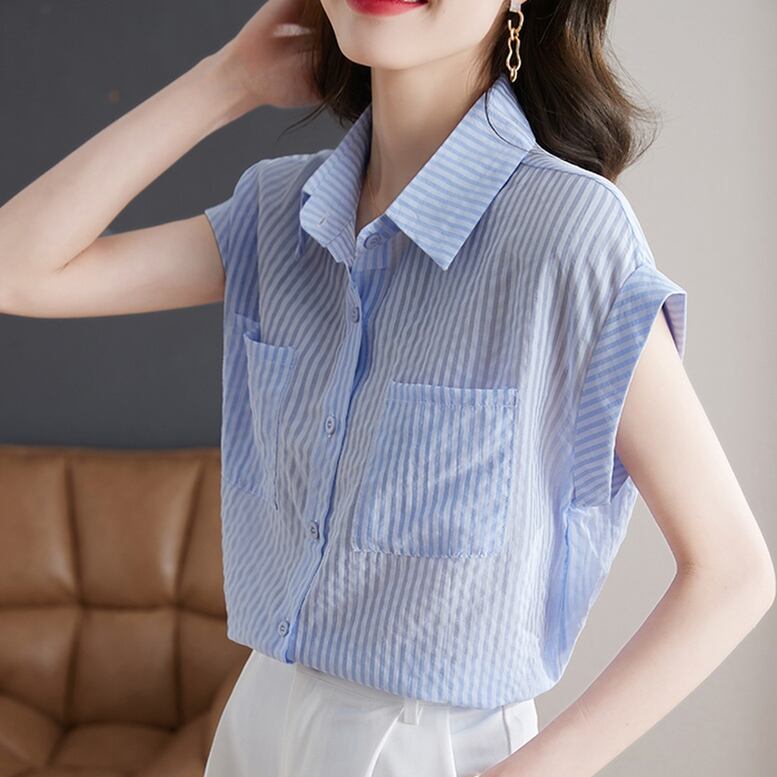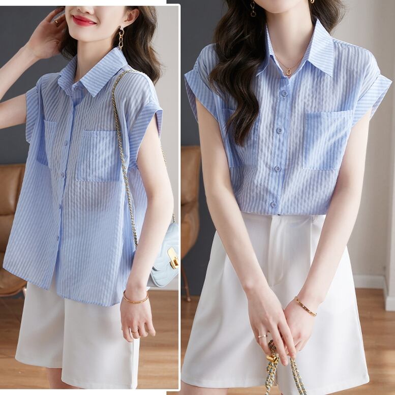 2color レディース ストライプ柄フレンチシャツ トップス シャツ フレンチスリーブ ストライプブラウス 半袖 襟付き シフォンシャツ 二の腕カバー ライトブルー ホワイト オシャレ シアー シンプル 可愛い キレイめ 上品 フェミニン シック 知的 ハンサム マニッシュ カジュアル 春 夏 デイリー おでかけ オンオフ兼用 普段着 スマート 細見え スタイルアップ 高見え 新鮮 上級者 主役級 鮮度アップ 軽やか ゆったり 体型カバー インスタ映え トレンド シャーベットカラー
