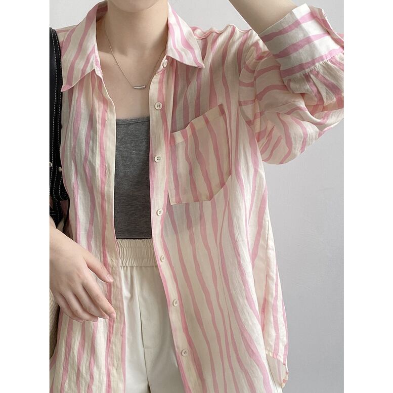 2color レディース ストライプシアーシャツ トップス シャツ ストライプ柄 長袖 襟付きシャツ ロングシャツ ブラウス 襟付き シフォン ピンク ブラック 抜け感 オシャレ シアー シンプル 可愛い キレイめ 上品 フェミニン ハンサム マニッシュ カジュアル 知的 春 夏 デイリー おでかけ 仕事 オンオフ兼用 普段着 王道 万能 スマート 細見え スタイルアップ 高見え 新鮮 上級者 主役級 鮮度アップ 軽やか ゆったり 体型カバー インスタ映え トレンド シャーベットカラー ベーシック